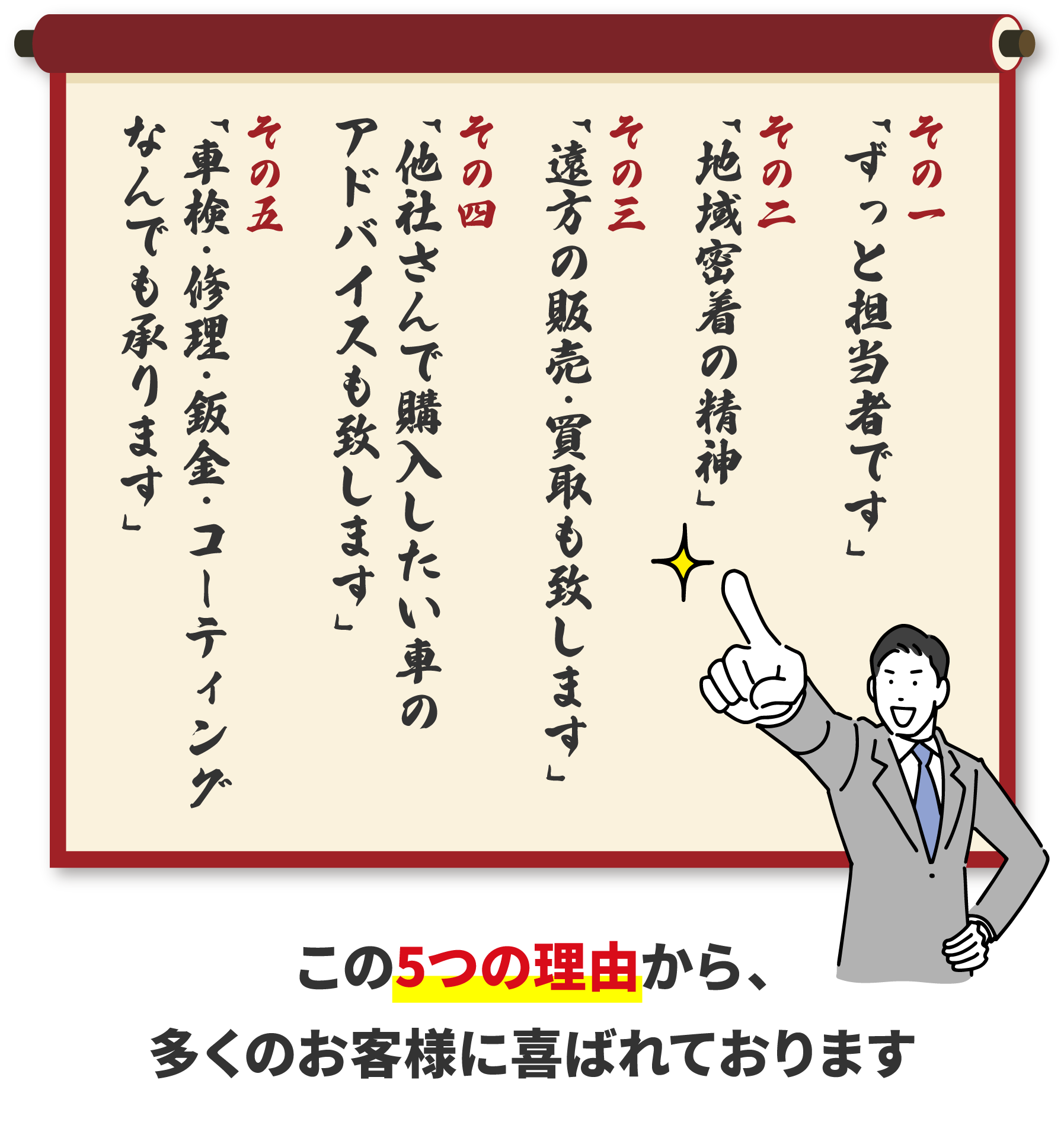 末永くお付き合い頂くもよし、何年かに⼀回のお付き合いもよし、頼りになる⾞屋、便利な⾞屋、友達のような⾞屋でありたいと考えております。